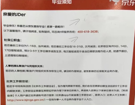 从网上的资料可以看到,京东的HR将裁员信称之为“毕业须知”,并在开头写道“毕业快乐!恭喜您从京东顺利毕业!感谢一路相伴!”