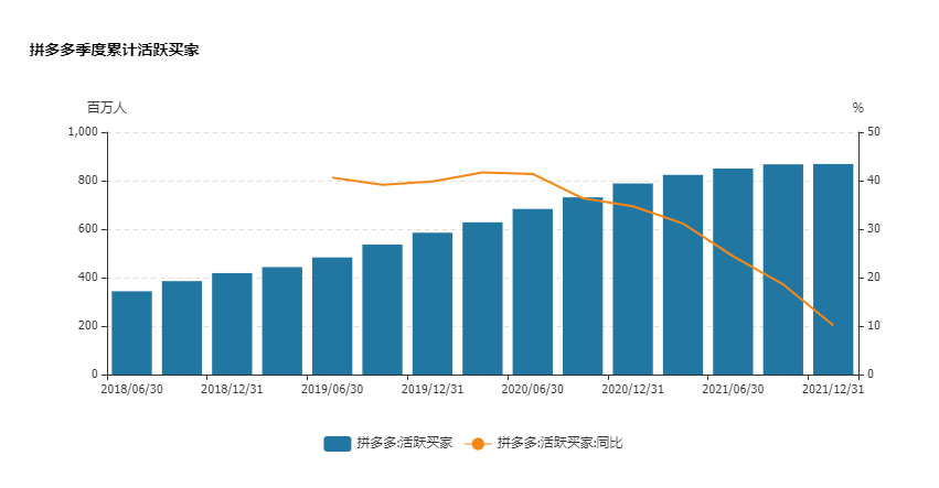 不仅如此,一直以来让拼多多最骄傲的用户增长速度也放慢了脚步。2021年四季度,拼多多月活用户平均约7.3亿,同比增长仅为2%。