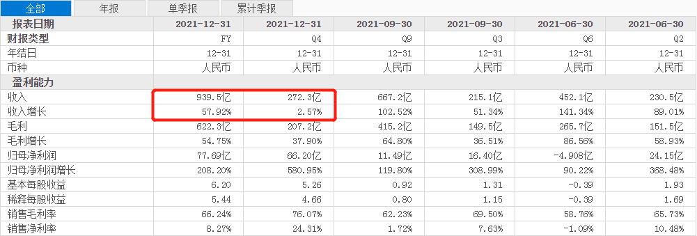 公司全年营收939.5亿,同比增长更是高达57.92%。