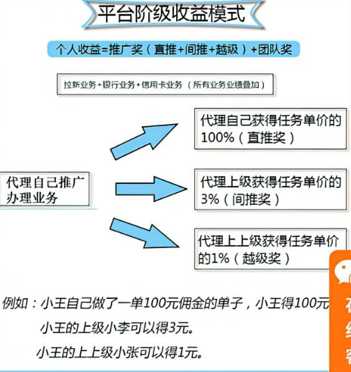 如果再越级,那么王五做的单,平台给李四补贴3%,给张三补贴1%,代理就得不到王五的间推跟越级的奖励,同样的赵六做的单,平台给王五补贴3%,给李四补贴1%,代理和张三是得不到间推跟越级的奖励!