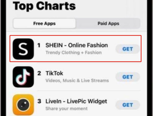 来自中国的快时尚电商SHEIN,成为新秀,下载量超过了TikTok、Instagram、Twitter等巨头,也远远超过了亚马逊。目前已经成为美国苹果应用商店下载量最大的APP。