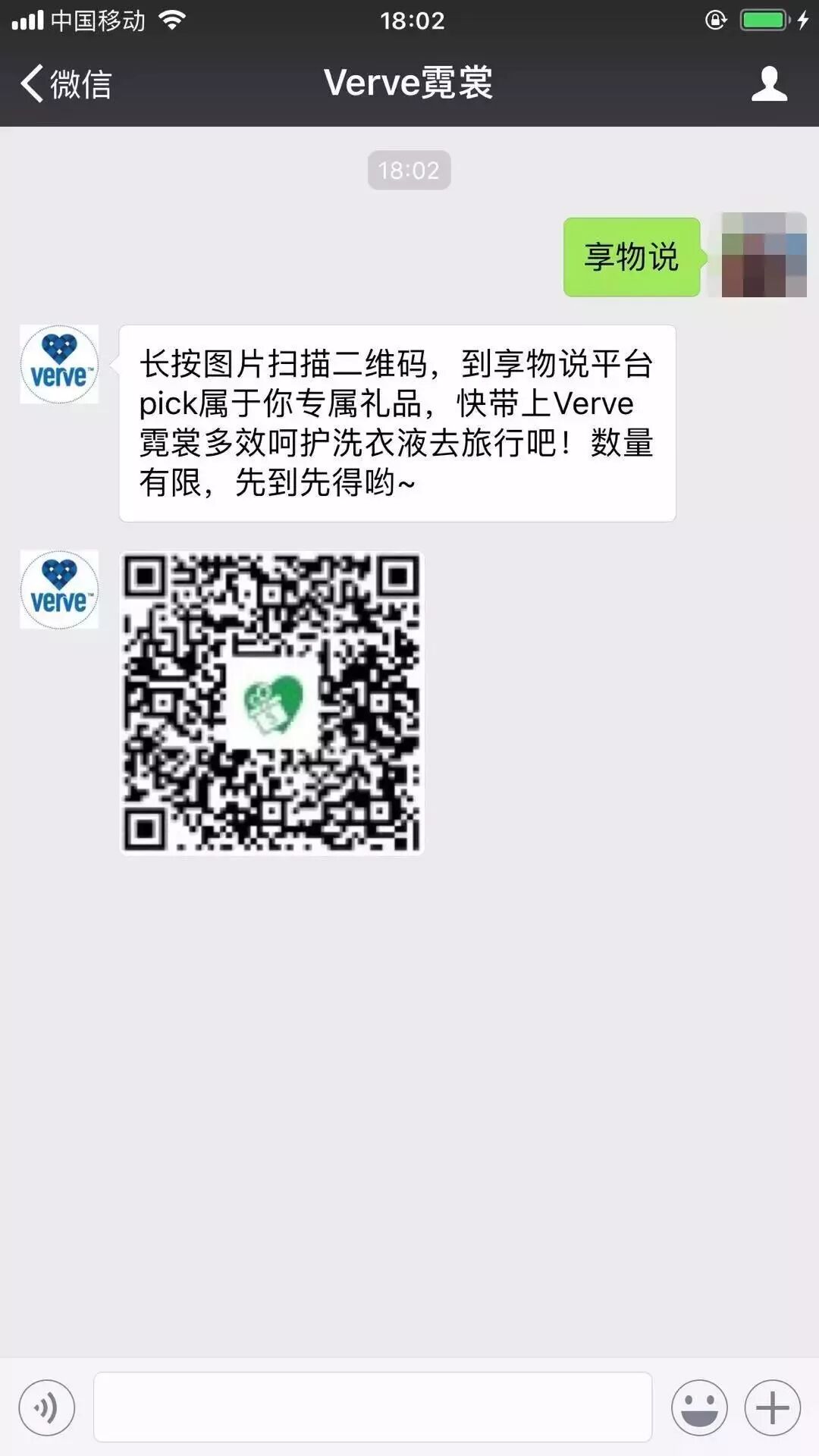 享物说将VERVE的信息精准推送与目标人群,引导引导受众分享产品海报到朋友圈,形成社交裂变传播,为VERVE引流;与此同时,Verve微信平台也为新用户推荐享物说二维码,引导上平台领取洗衣液。