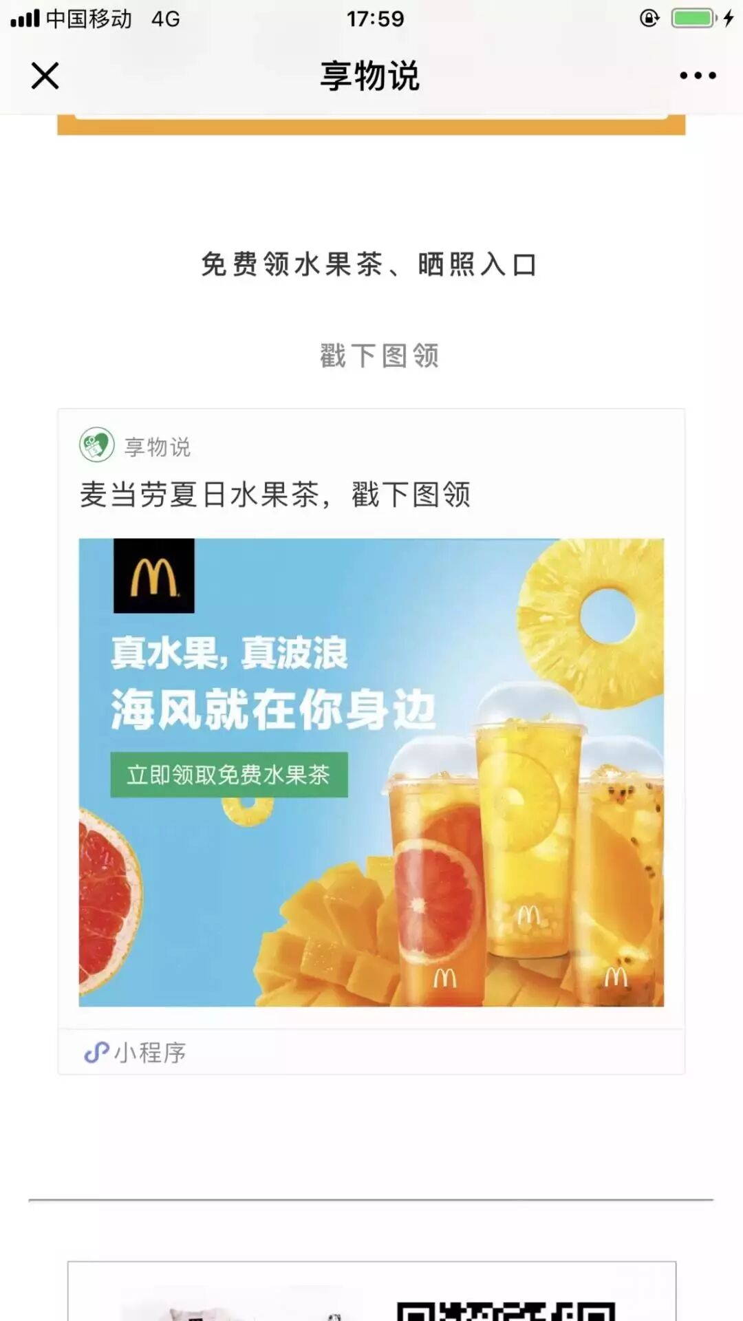 当时,享物说的公众号发表一篇麦当劳水果茶的推文,发起“真水果,晒靓照”的UGC互动,并提供了免费优惠券,用奖励优惠机制来刺激用户消费。在自身APP平台上以首页焦点图等进行曝光,将新品推广、消费调研和晒照捆绑一起做,这波玩法不得不说聪明。