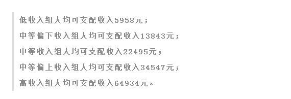 即使以高收入组为标准,折算成每月可支配收入也就5400元。如果把极少数富裕群体扣除在外,那么每月5000元的可支配收入,差不多已经超过了90%的人群。
