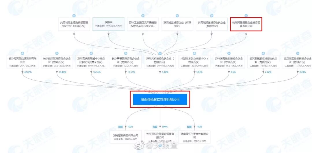 消息的来源是天眼查官方微博,27日下午,天眼查官微声称「阿里巴巴在6月间接入股了茶颜悦色的主体公司。」其附上的图片显示,茶颜悦色总公司的股东中新增了「苏州元初投资合伙企业」,该公司的股东之一,正是「杭州阿里巴巴创业投资管理有限公司」。