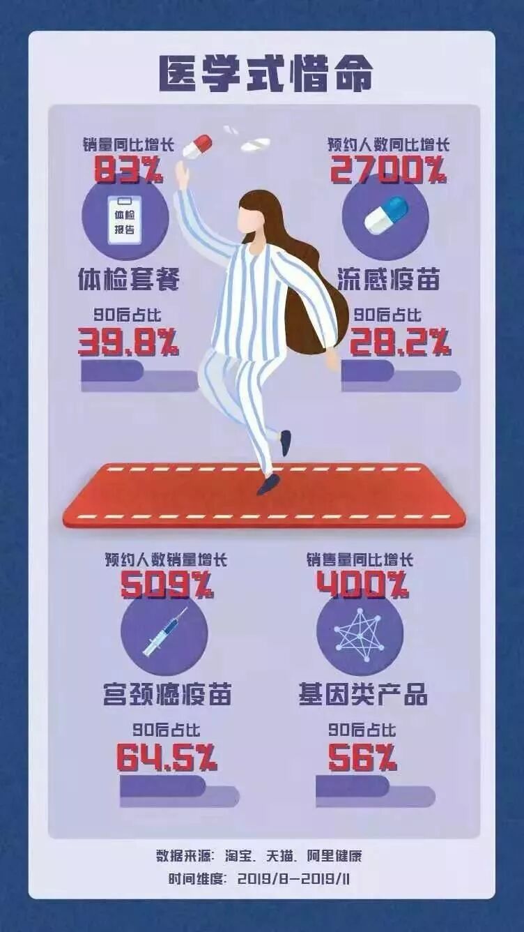 但淘宝的报告似乎告诉我们,事实并非如此,除了体检套餐数据表现良好,90后还将流感疫苗、基因类产品、宫颈癌疫苗等医疗消费项目,纷纷都安排上了。