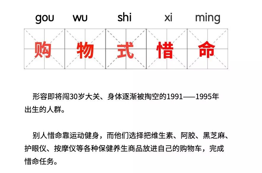 购物式惜命,无疑就是“朋友圈里养生打卡,半夜里购物玩命”,他们更喜欢用购物养生品,来缓解作死的焦虑。