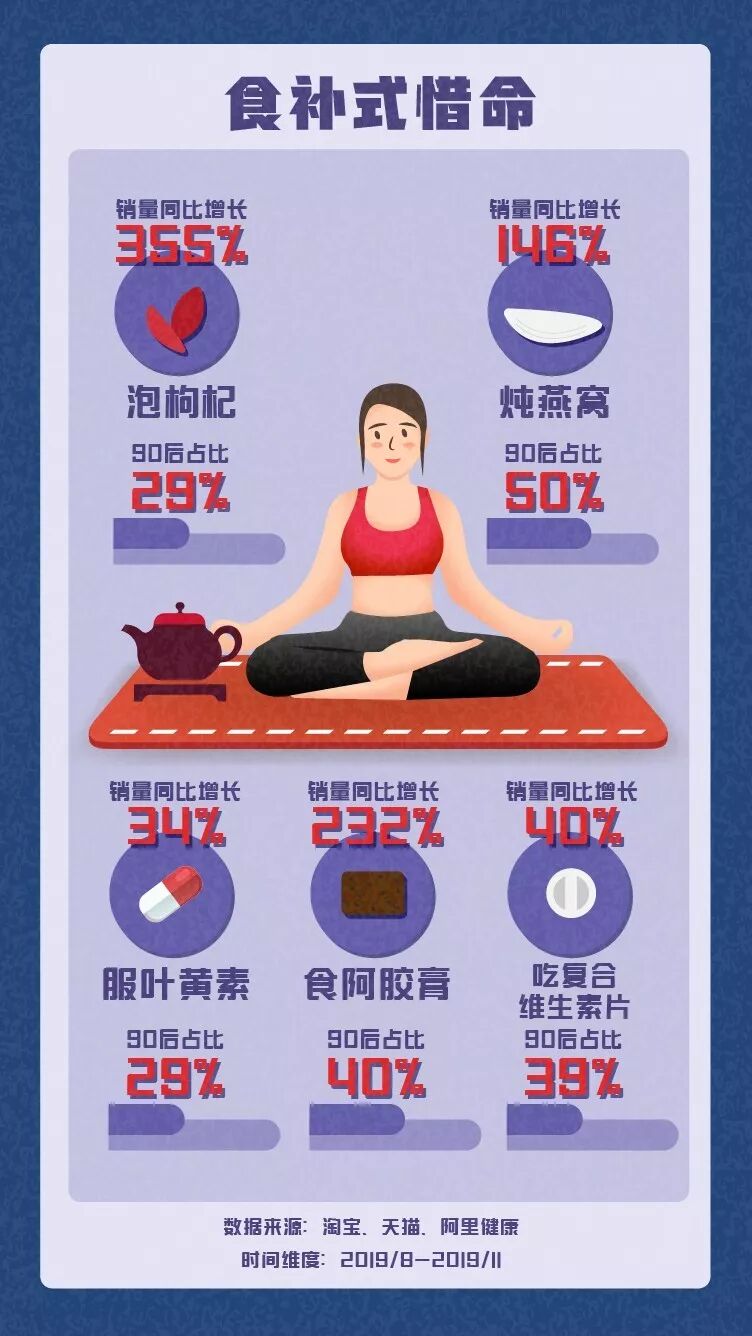 比如说,有的选择炖燕窝,这个90后比例达到五成,只能说养生也需要有钱才能养得起。再看看相对廉价的食补方式,90后吃复合维生素片的达到39%,占比也不小。