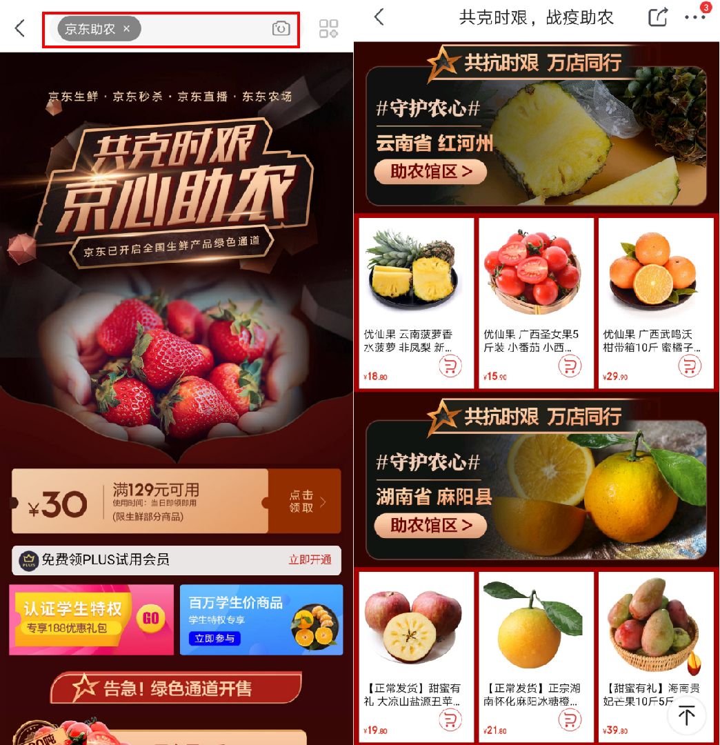 作为普通消费者,可以在京东首页或者微信搜一搜“京东助农”,进入京心助农会场下单果蔬生鲜,或者转发本文让更多的人参与互动。