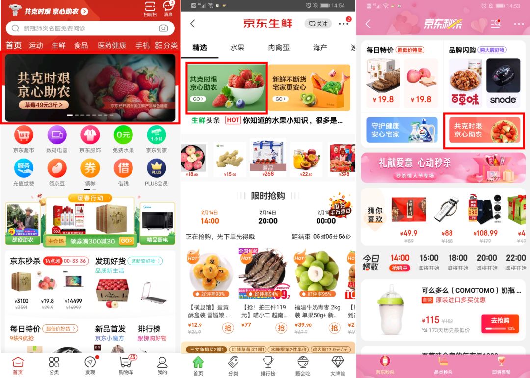 站内,京东开放频道资源,整合京东首页banner、京东生鲜频道、秒杀频道、直播频道、东东农场等板块资源,上线助农的活动页面。让活动信息变得无处不在,确保消费者购买触手可及。通过创造随时可见、随时可触的消费场景,满足他们在任何时间、多个页面获取购买信息,提升他们的购买体验。
