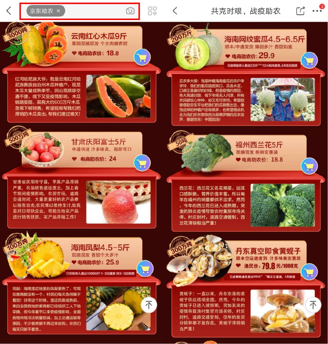 小程序作为除朋友圈外、用户使用频率最高的应用,京东还联合腾讯合作上线“京东助农”小程序,通过站外流量用户的导入,实现精准的目标导向。用户只要在微信搜一搜“京东助农”,就能直接进入京东助农活动会场,选择合适的农产品即可下单。