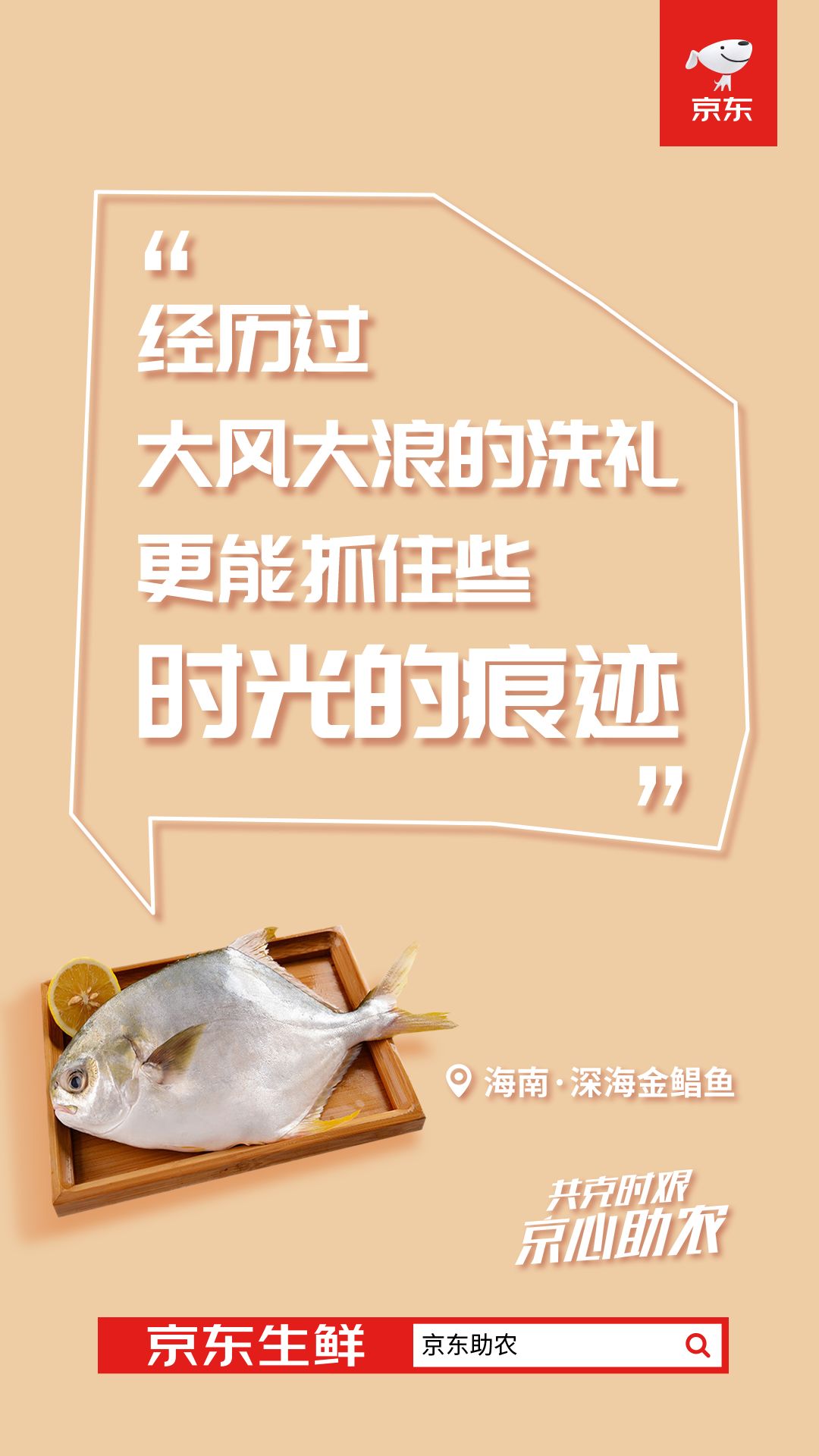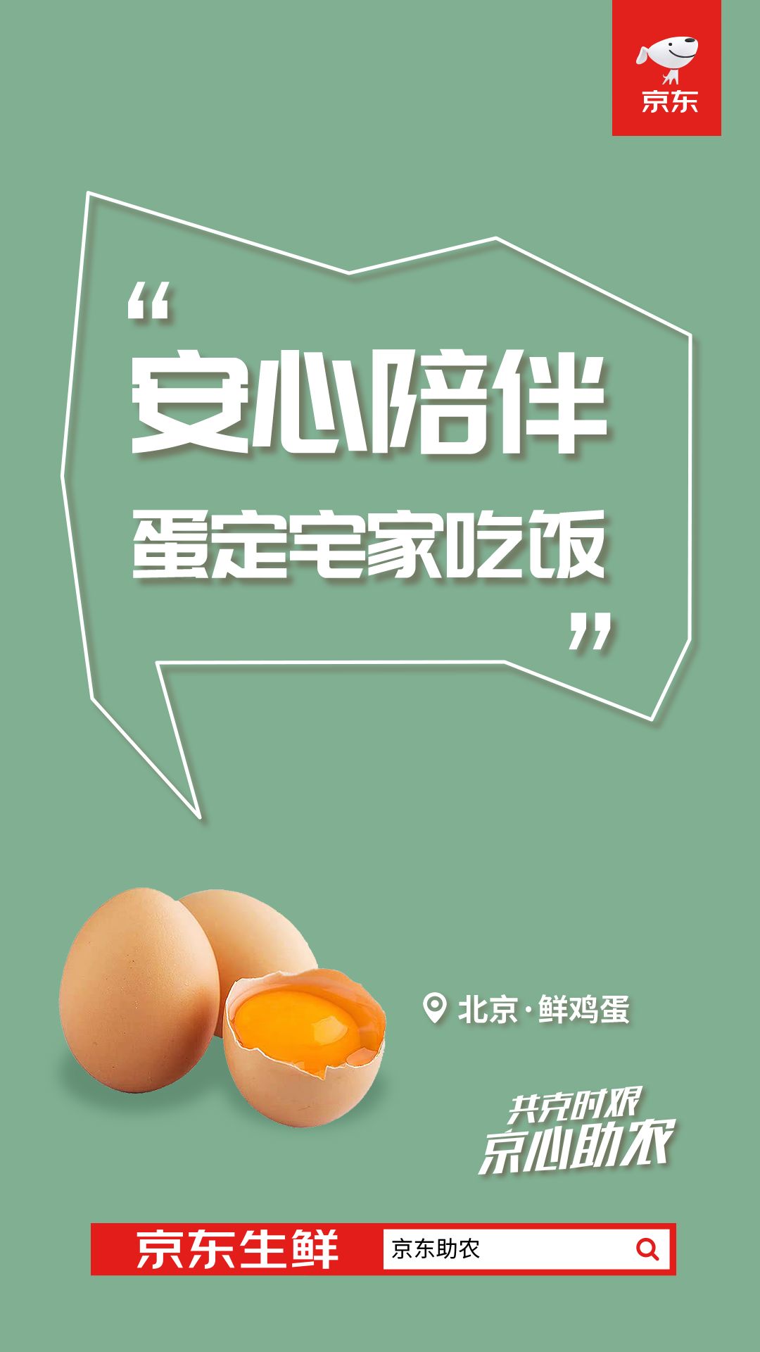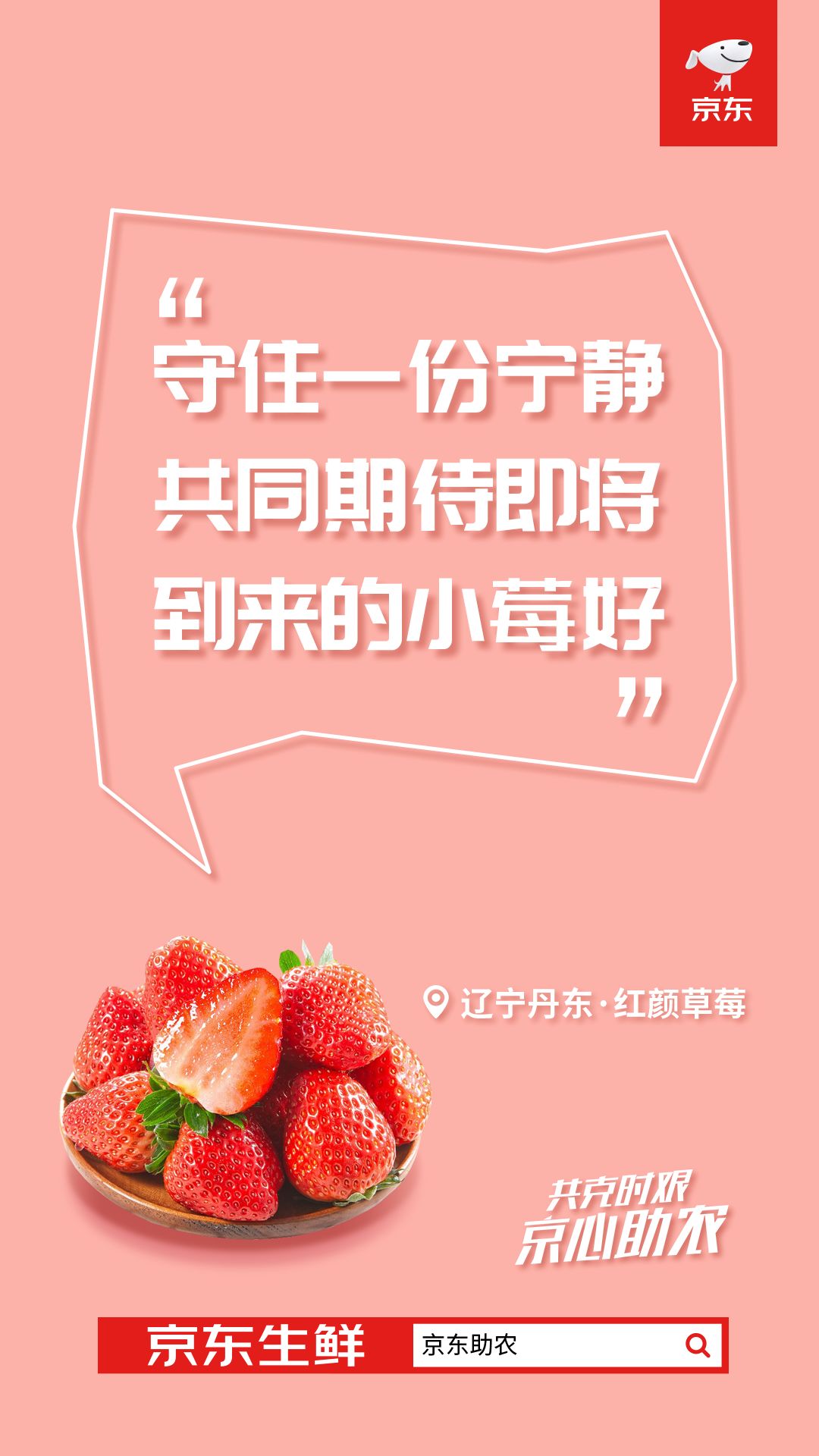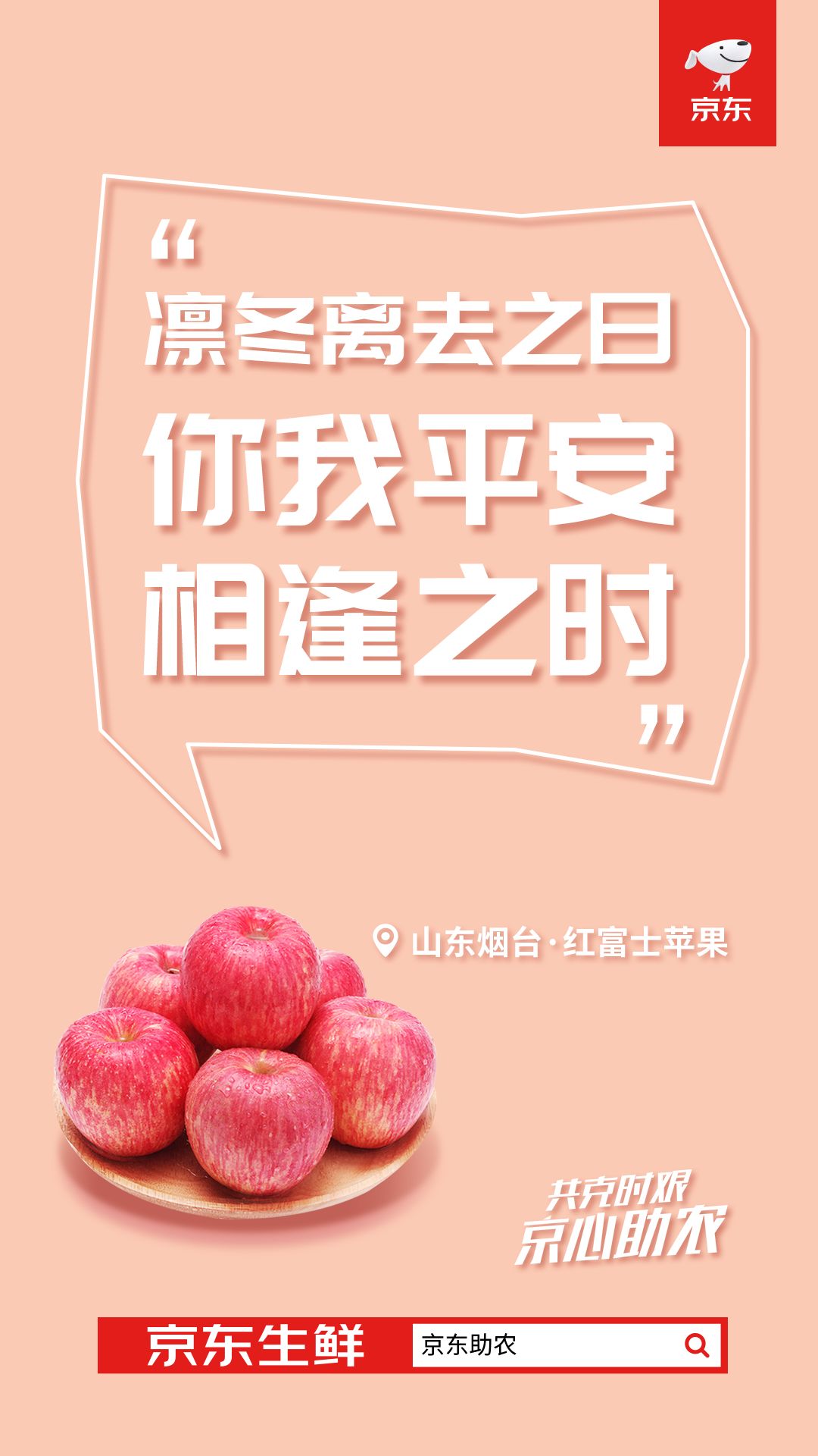 站外,京东生鲜在官方微博上线一组加油海报,结合不同果蔬生鲜的特质,以果蔬生鲜的第一视角,向应对疫情的消费者加油鼓励。比如巧借“平安”和“苹果”的谐音,强化了山东烟台红富士苹果的安全感。京东生鲜借助谐音梗,传递“共克时艰”的正能量,加深了消费者对于京东生鲜产品“安心”、“淡定”的感知。