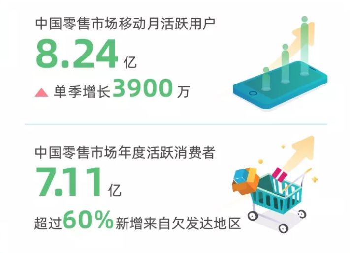 根据财报显示,中国零售商业移动月活用户为8.24亿,单季增长3900万;年度月活用户数为7.11亿,其中超过60%的新增用户来自欠发达地区。