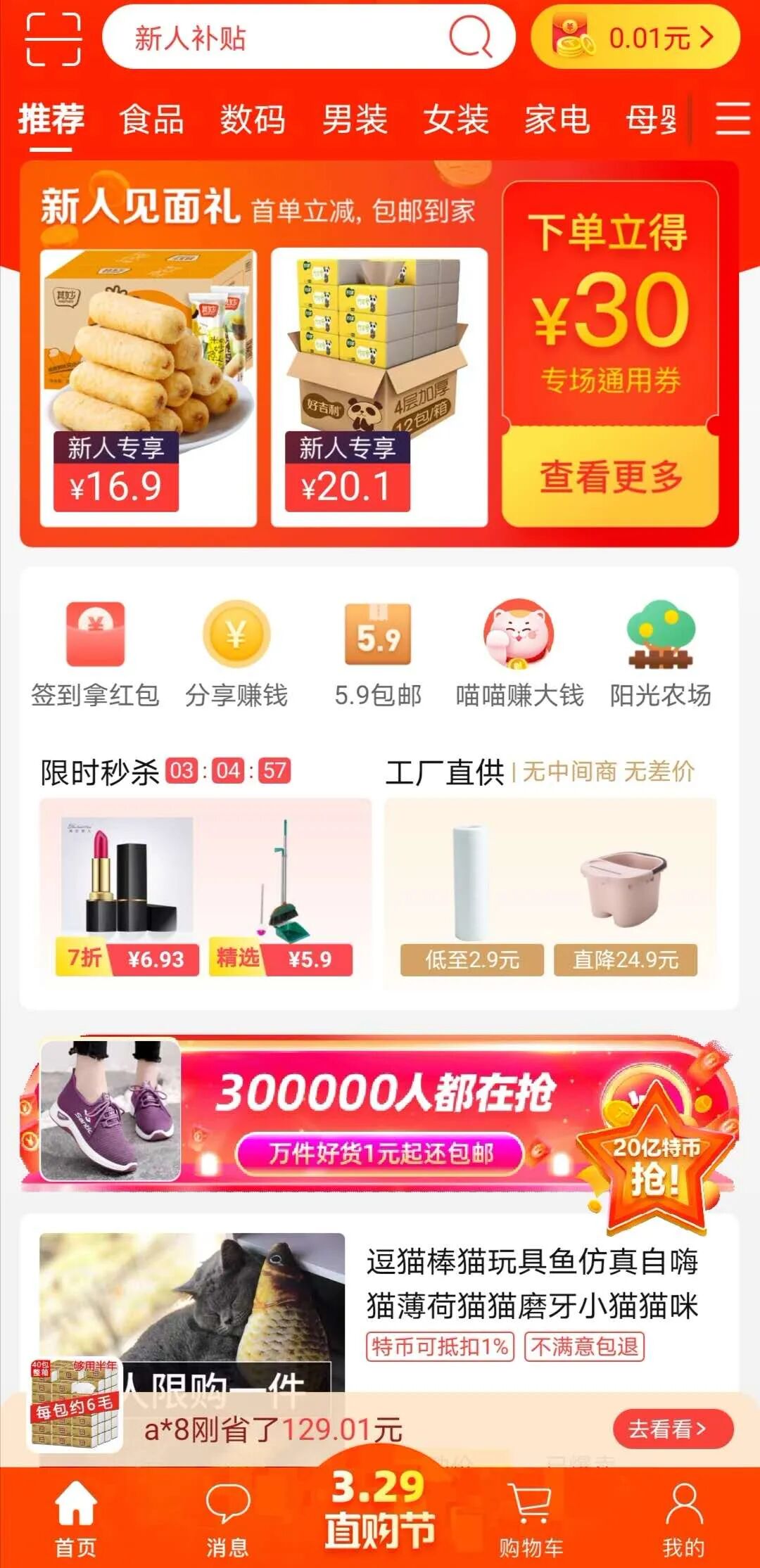 在价格上,淘宝特价版不仅比聚划算低,而且还击穿了天天特卖的“9.9包邮”,推出了“5.9包邮”窗口;在定位上,淘宝特价版瞄准的是下沉市场,通过低价和红包补贴的方式,营造出极致性价比的产品印象。