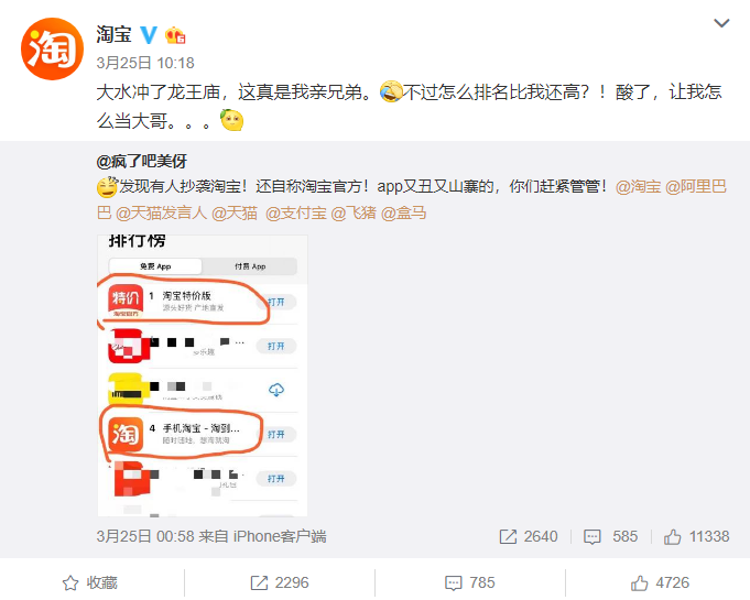 3月25日凌晨,一位网友发布微博消息称“发现有人抄袭淘宝!还自称是淘宝官方!APP又丑又山寨,你们赶紧管管”,并且特地艾特了淘宝官方微博。
