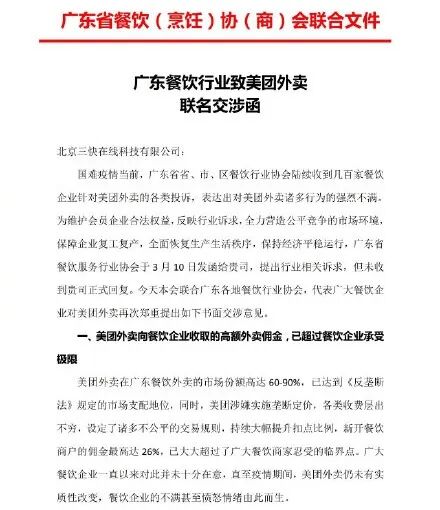 4月10日晚,广东省餐饮协会发布的《致美团外卖联名交涉函》,控诉疫情期间线下餐饮商家面临经营困境的同时,美团却上调了佣金。