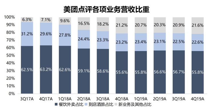 但外卖业务仍旧是美团收入的核心来源,仅从2019年第四季度营收来看,外卖业务占比达到了总营收(餐饮外卖、到店、酒店及旅游部分、新业务及其他部分)55.8%。