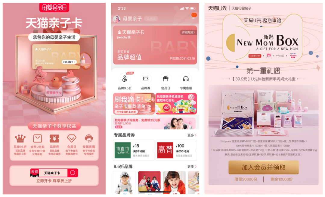 面对90后95后年轻妈妈群体,天猫母婴亲子把品牌人群资产划分三大主力运营板块。第一,全域运营,包括二三方生态及整个内容的运营平台,助力品牌用户增长全面提速;第二,私域运营,通过千人千面、场景购、搭配购、专属客服、会员CEM等,让品牌与用户的沟通更精准、更高效、更好玩,提高品牌精细化运营消费者的效率;第三,天猫今年全新重磅推出的亲子卡业务,为用户所打造的高品质、整体性育儿方案,同时也在中长期链接、撬动着母婴服务和教育市场。拥有亲子卡的用户不仅可享受到大牌的全年折上95折,还可以领取到对应育龄的权益大礼包,并体验早教、品牌专属客服等服务。通过亲子卡,天猫将为中国父母带来全新的母婴亲子购物体验。