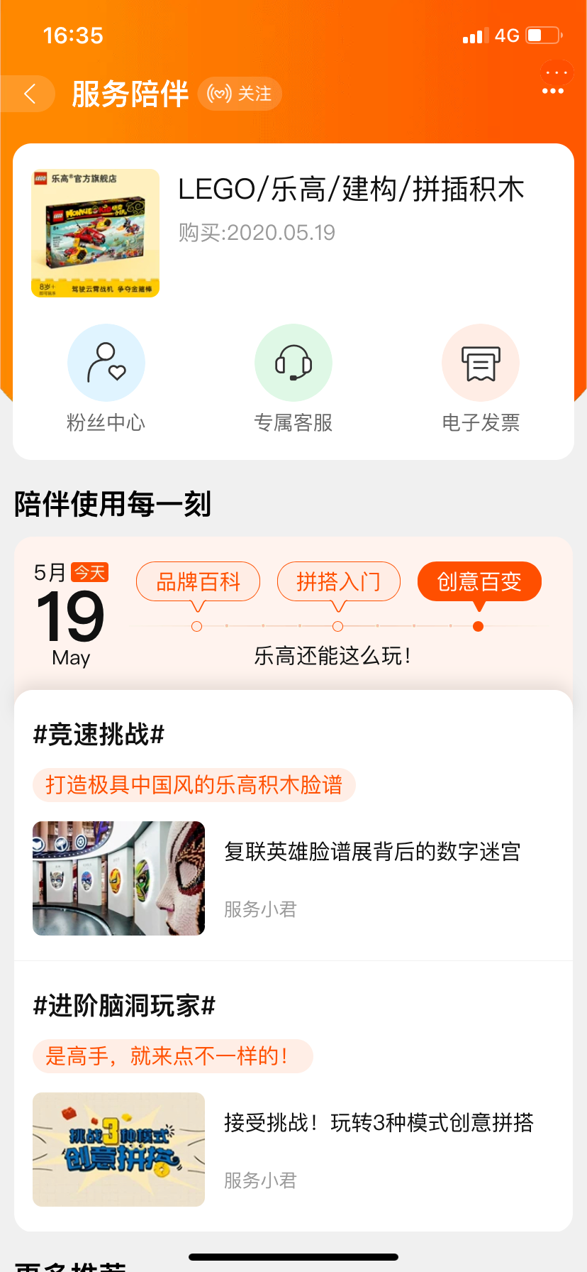 今年,天猫母婴亲子将针对行业不同的特性,打通链路,给消费者提供类似安装指南、新妈攻略、AR量脚、清洗保养、免费维修等多种售后垂直服务。今年,乐高品牌正式与天猫达成战略合作,打造乐高人群的针对性购后沟通及服务阵地,依托天猫,建立乐高免费补件中心,让乐高的粉丝可以通过乐高天猫服务陪伴完成对消费者的补件需求,增加“品牌速递”、“拼搭指南”等品牌百科信息,让消费者在天猫平台享受商品全生命周期的售后服务,有服务,有攻略,有内容,有互动,有粘性。天猫购买乐高,售后体验一站式全程无忧。