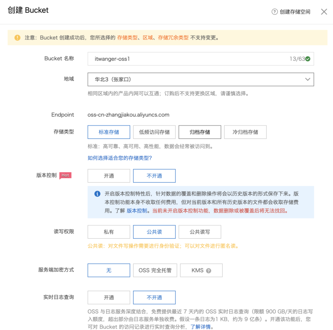 Bucket 的词面意思是桶,这里指存储空间,就是用于存储对象的容器。注意读写权限为“公共读”,也就是允许互联网用户访问云空间上的图片。