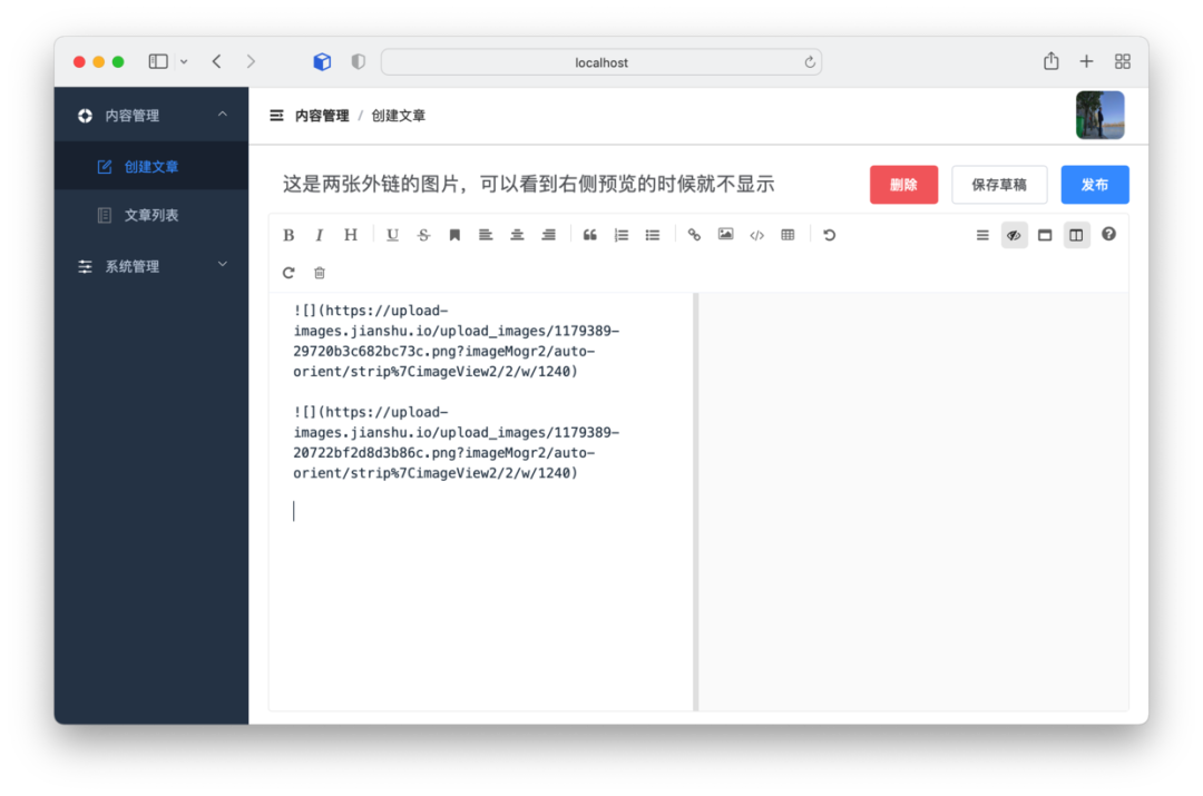 第三步,通过 Web 管理端来测试外链是否转链成功。先找两张外链的图片,可以看到 markdown 在预览的时候就不显示。