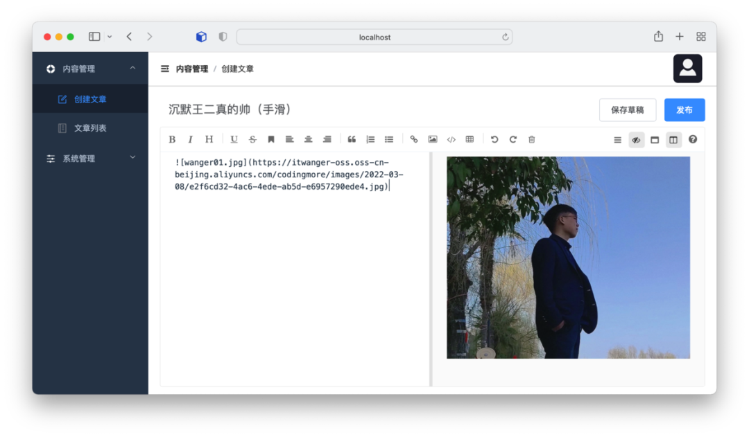执行 yarn run dev 命令后就可以启动 Web 管理端了,进入到文章编辑页面,选择一张图片进行上传,可以确认图片是可以正常从前端上传到服务器端,服务器端再上传到 OSS,之后再返回前端图片访问链接的。
