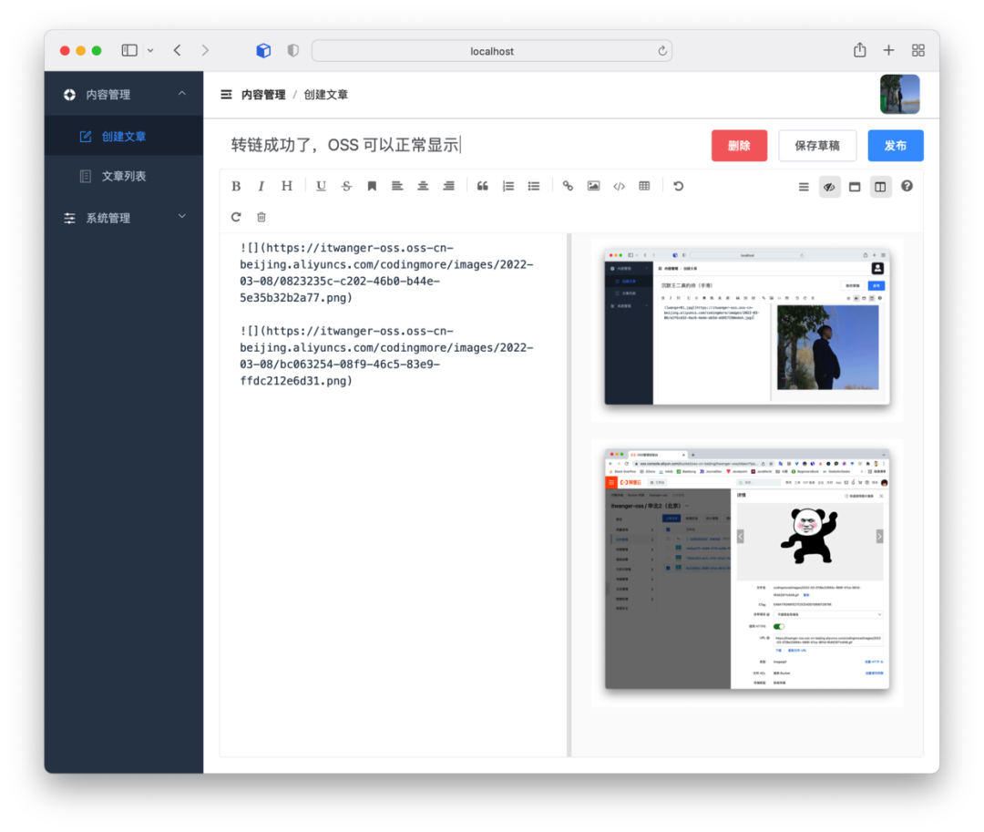 然后我们点击发布,可以看到两张图片都正常显示了,因为转成了 OSS 的图片访问地址。