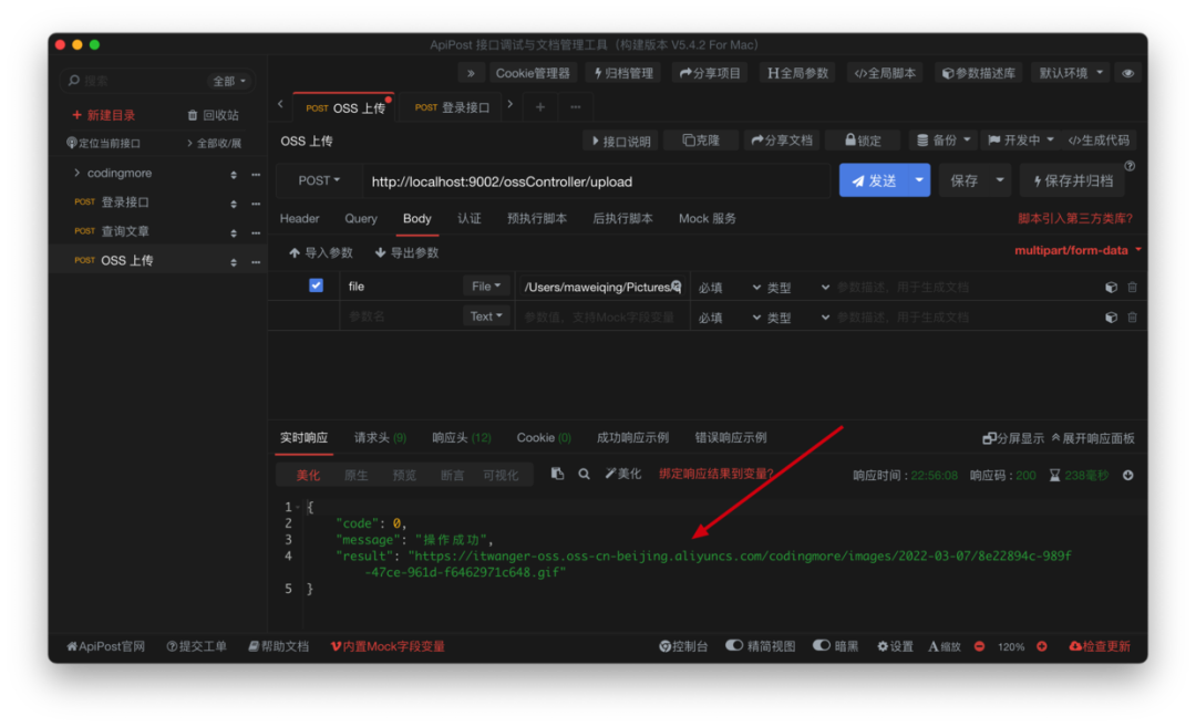 第六步,打开 Apipost,测试 OSS 上传接口,注意参数选择文件,点击发送后可以看到服务器端返回的图片链接。