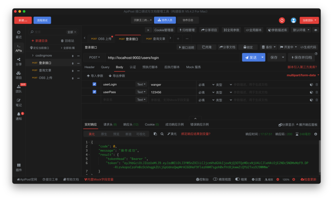 第一步,测试登录接口,Apipost 直接访问 http://localhost:9002/users/login,可以看到 token 正常返回。