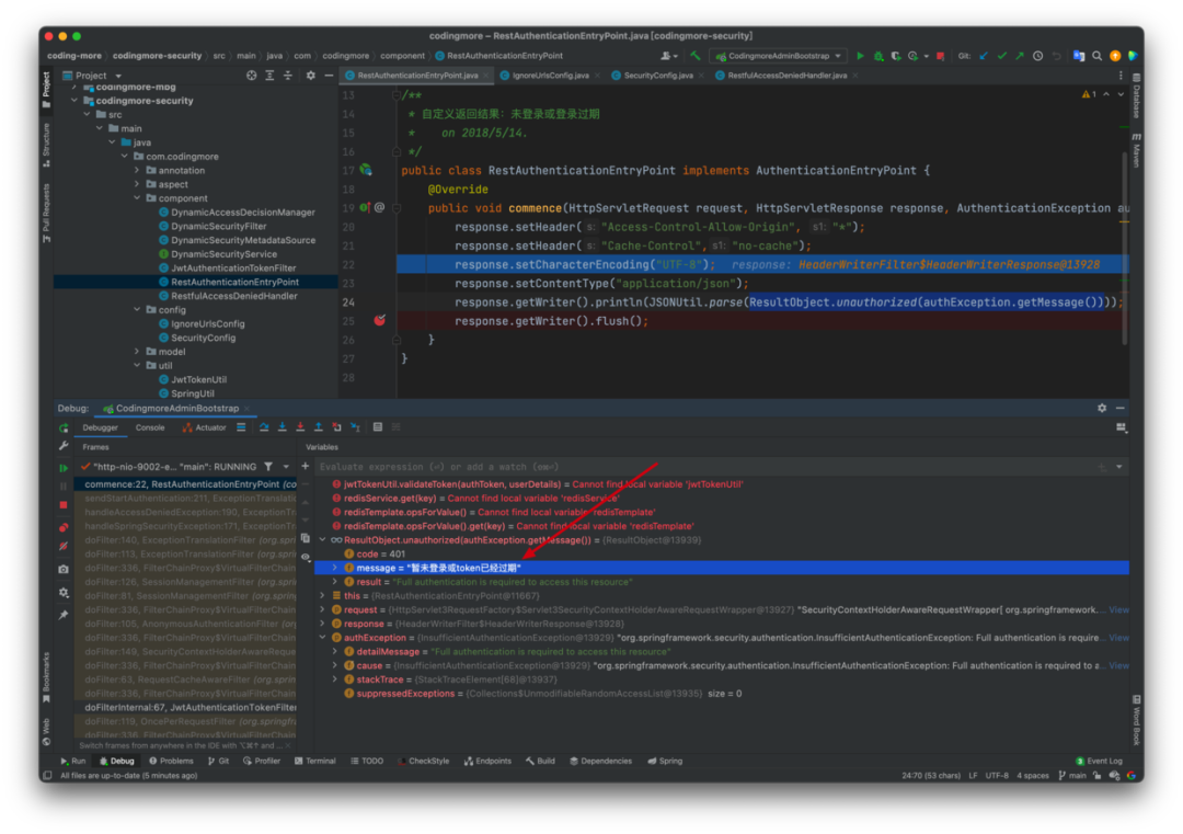 重点来看其他四个类。第一个 RestAuthenticationEntryPoint(自定义返回结果:未登录或登录过期):
