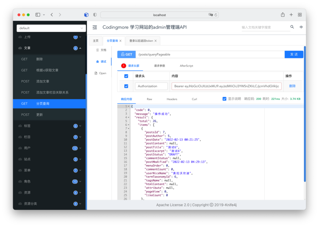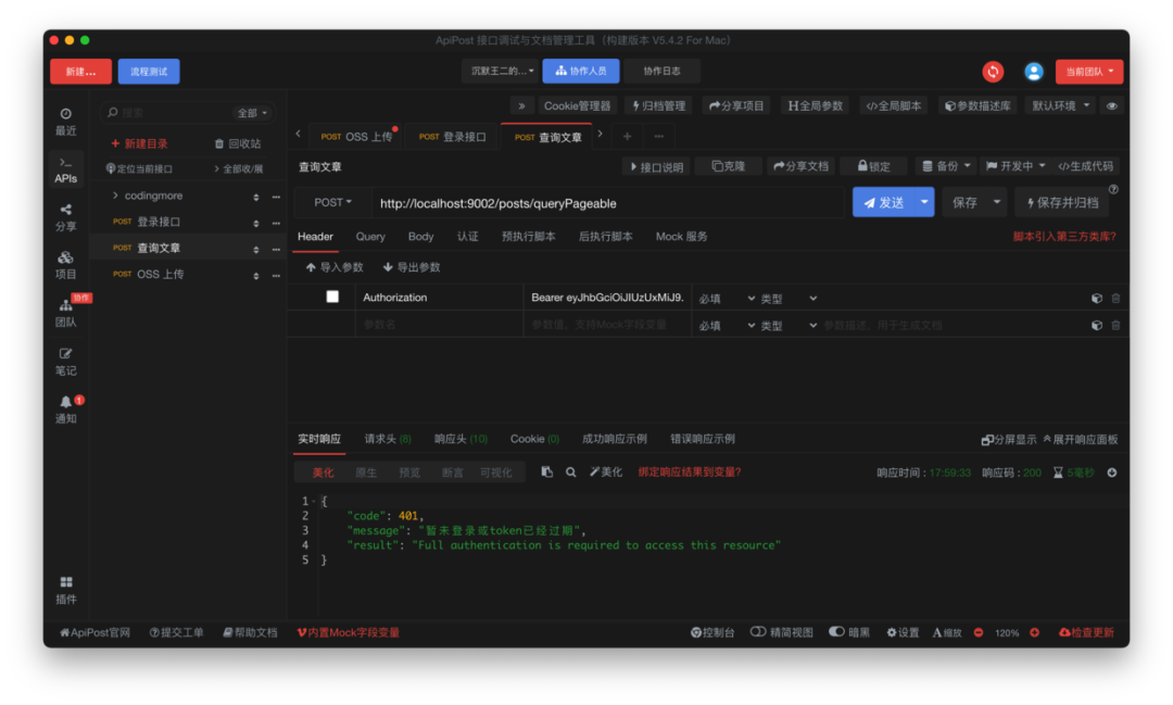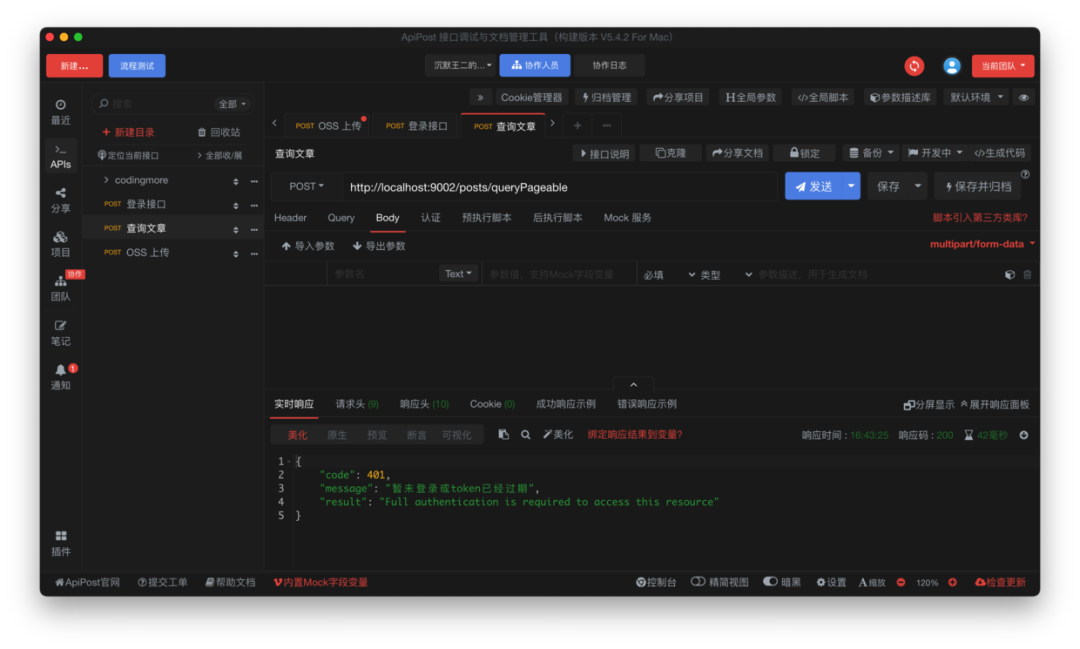 使用 Apipost 来测试一下,首先是文章获取接口,在没有登录的情况下会提示暂未登录或者 token 已过期。