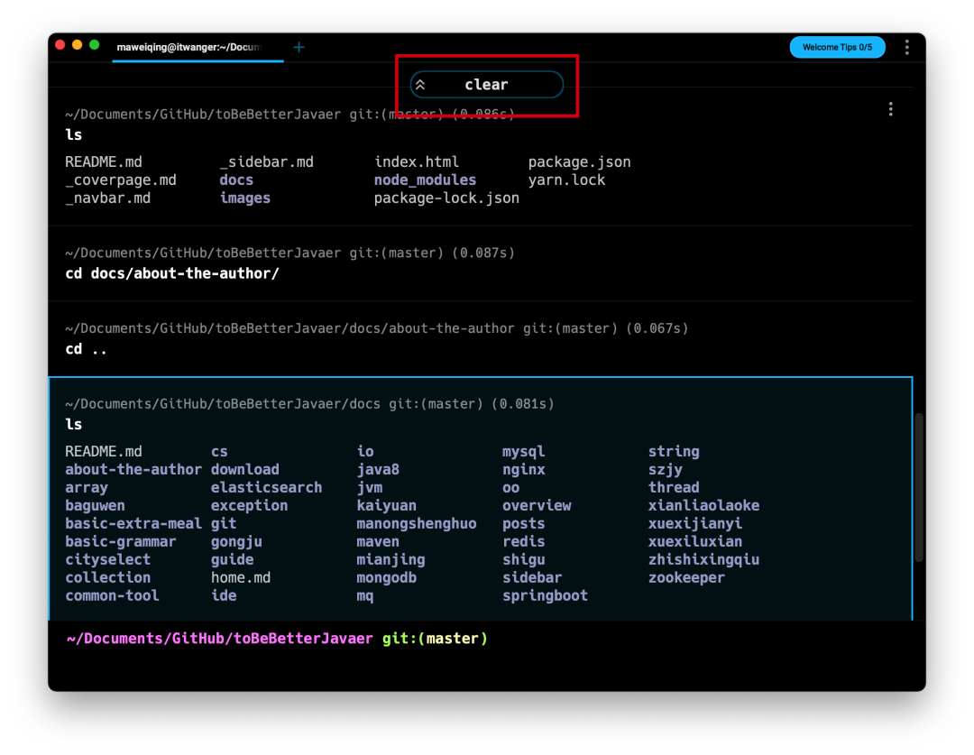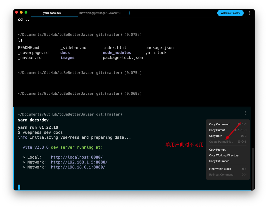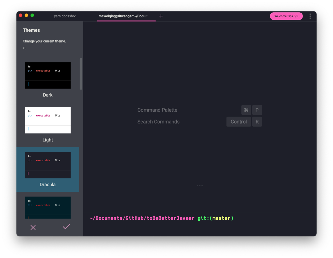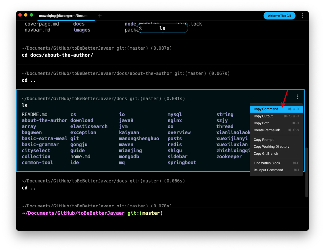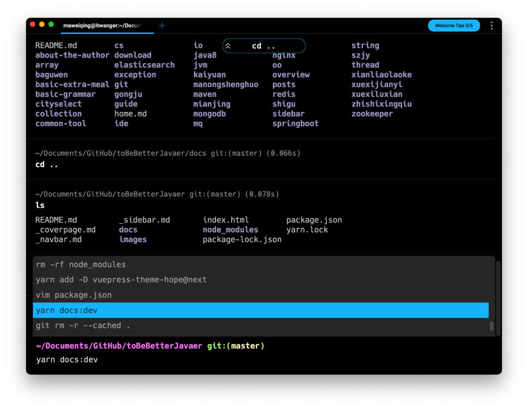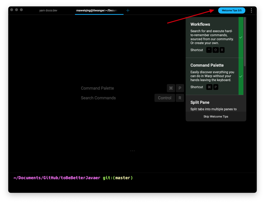 至于快捷键配置,如果不确定有哪些快捷键可以尝试,直接点击 Warp 顶部的这个温馨提示「welcome tips」就可以了。
