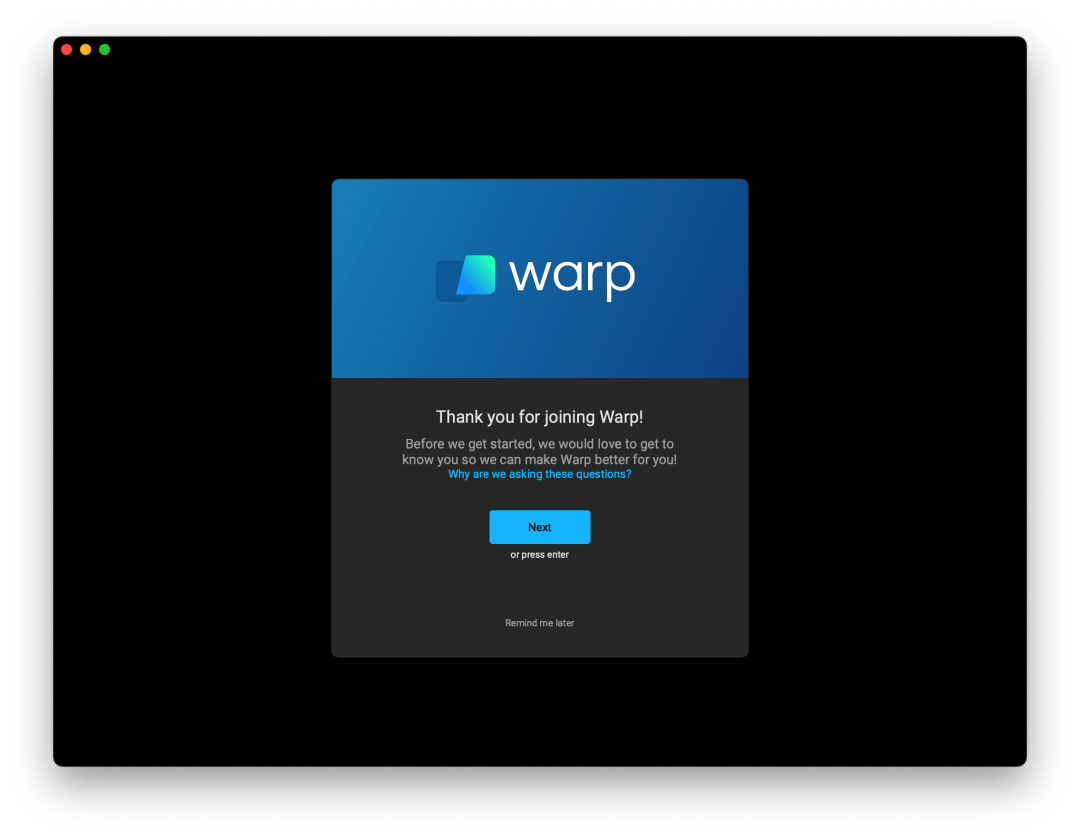 填写一些 Warp 的调查信息后,就会跳转到 Warp 的初始界面。