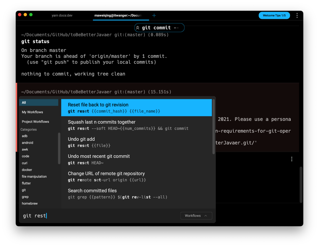 同时按下 Ctrl+Shift+R 可以打开命令导航,Warp 集成了很多工具的命令导航。比如说我们要执行 git reset 命令,那么到底格式什么,应该怎么执行,Warp 都提示的非常到位。