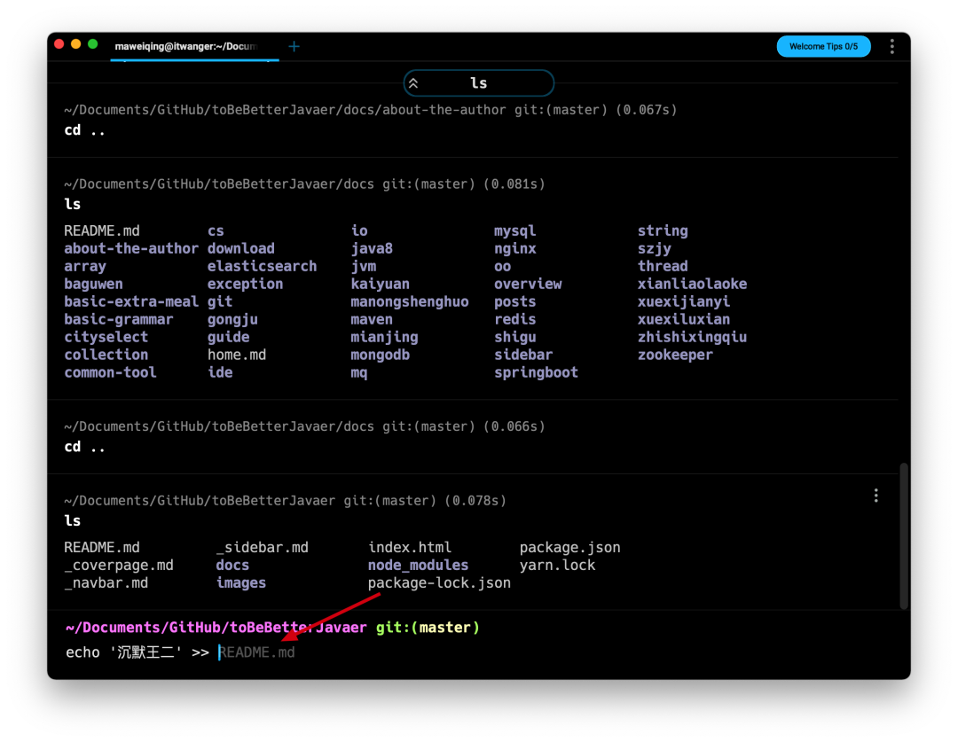比如说我的工作目录下有一个 README.md 的文件,那当我输入 echo '沉默王二' >>的时候它会把 README.md 提示在后面。