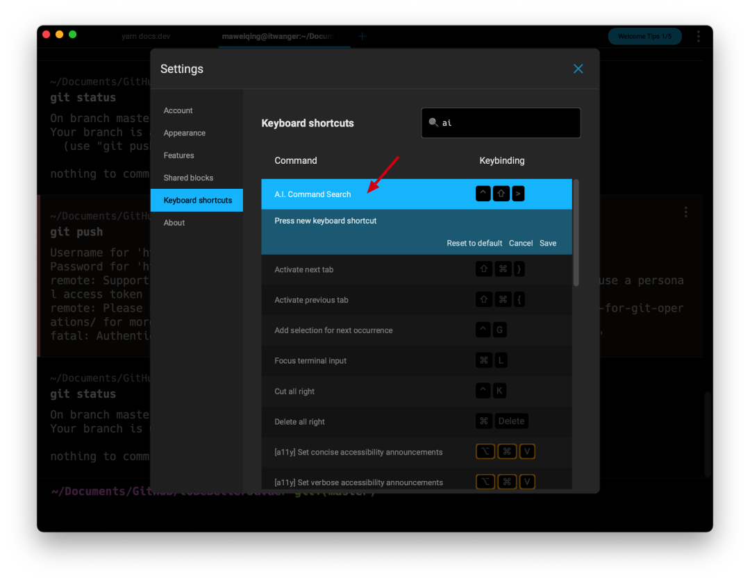 Warp 还提供了 AI 智能搜索,快捷键可以在 setting→keyboard shortcuts 中找得到,键入 AI 关键字即可。