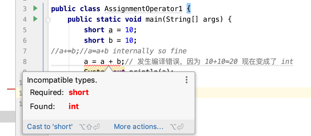 编译器之所以提示错误,是因为 = 右侧的算术表达式默认为 int 类型,左侧是 short 类型的时候需要进行强转。