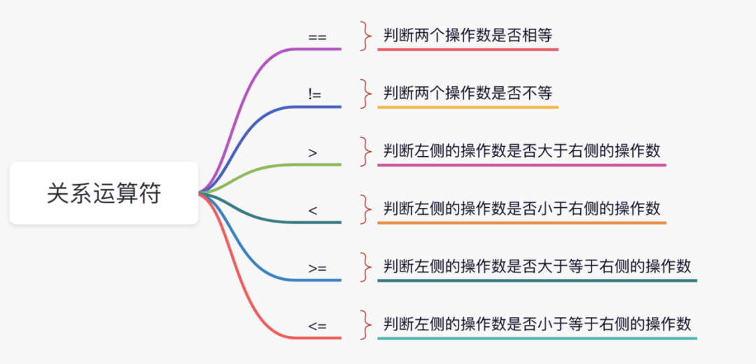 /** * 微信搜索「沉默王二」,回复 Java */public class RelationOperator { public static void main(String[] args) { int a = 10, b = 20; System.out.println(a == b); // false System.out.println(a != b); // true System.out.println(a > b); // false System.out.println(a < b); // true System.out.println(a >= b); // false System.out.println(a <= b); // true }}