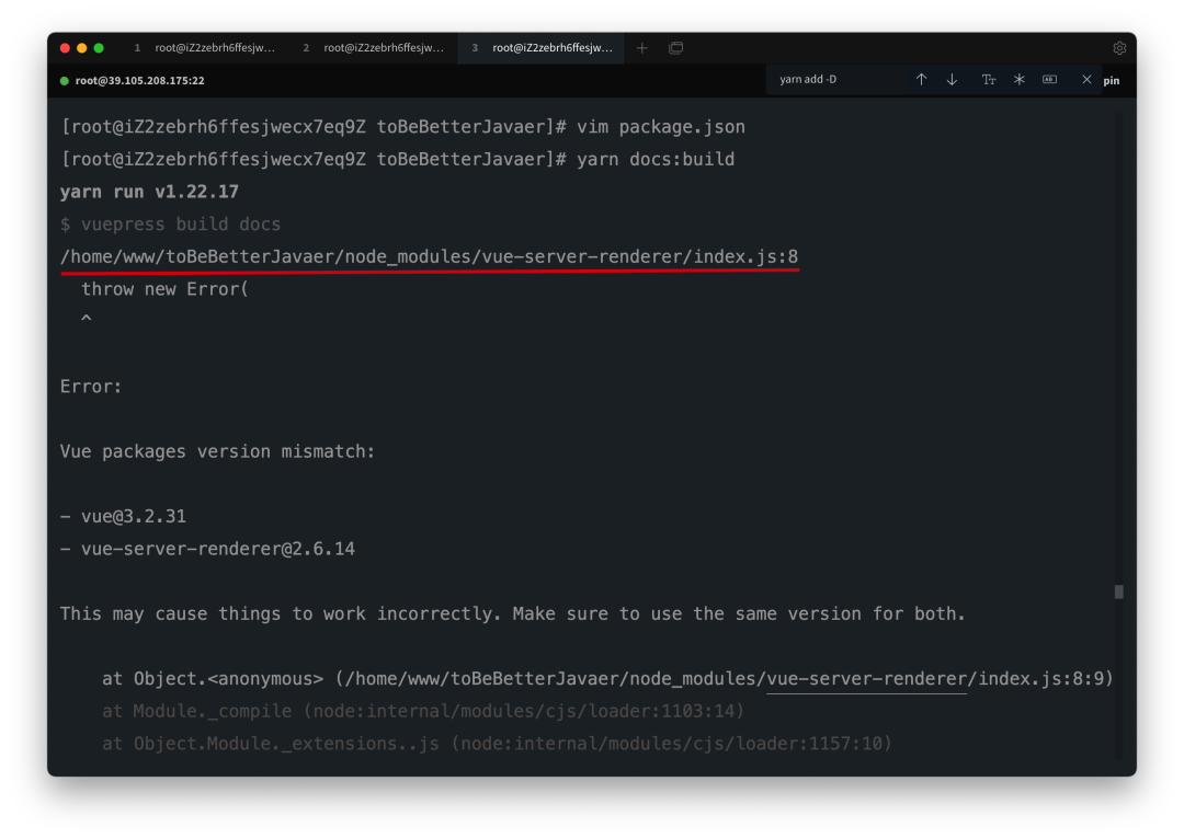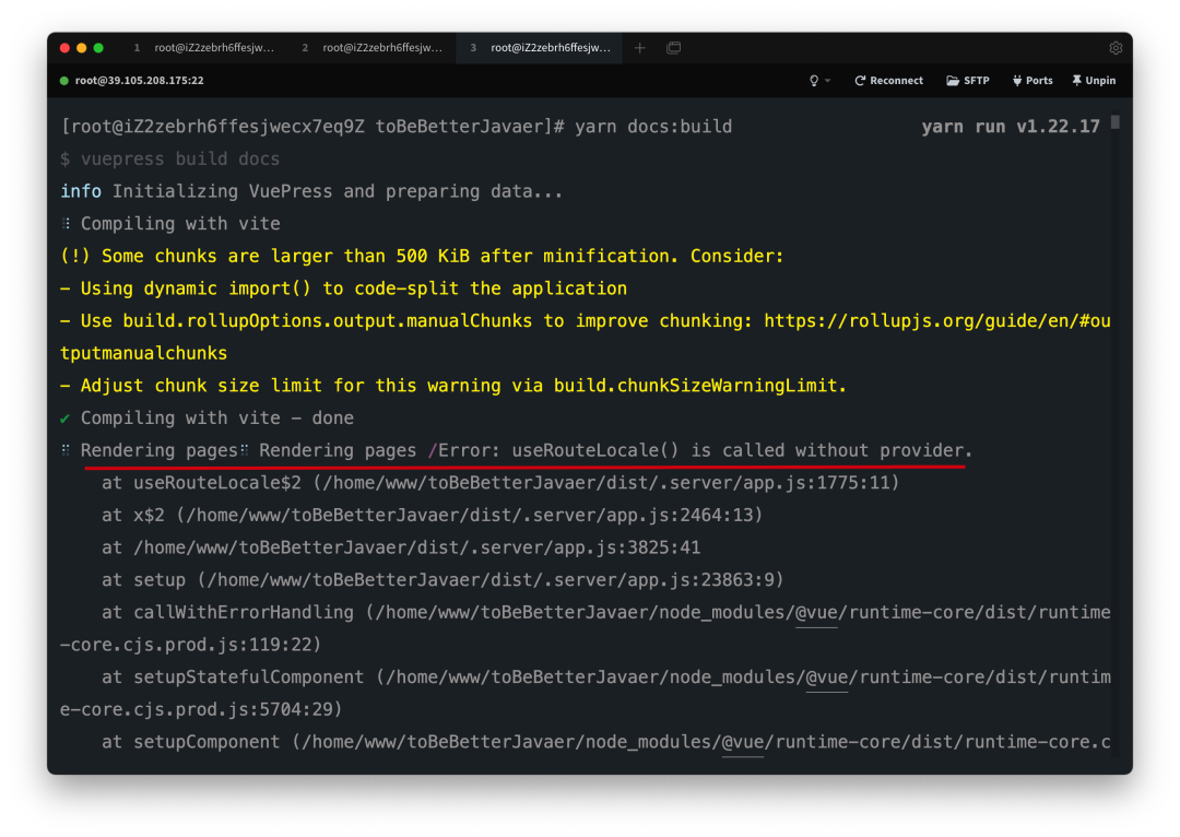 然后,当我执行 yarn docs:build 重新构建网站内容的时候就构建失败了!