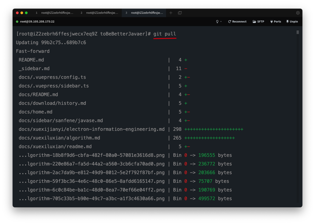 第二件,执行 git pull 从 GitHub 远程仓库拉取最新文档到服务器。