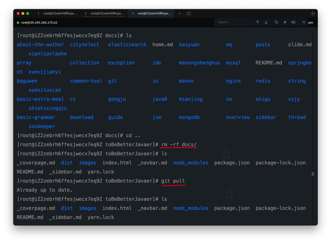 于是我就灵机一动,先删除 docs 目录再使用 git pull 从远程仓库拉取最新内容覆盖本地仓库不就完事了吗?