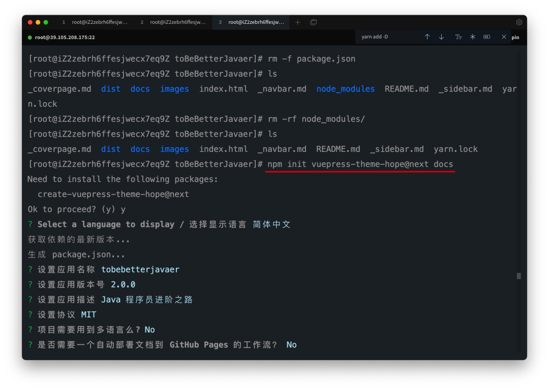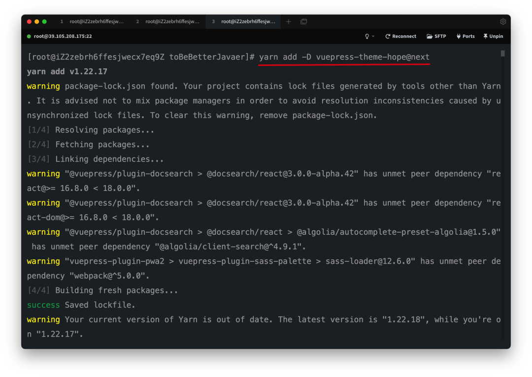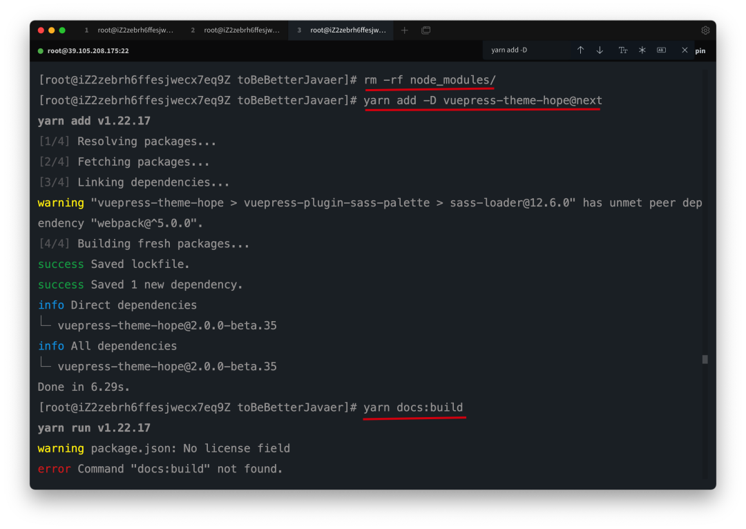 第一件,执行 yarn add -D vuepress-theme-hope@next 命令对该主题进行升级。
