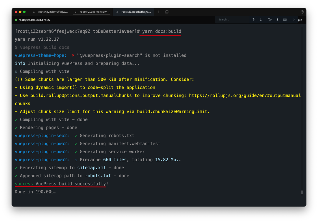 vuepress-theme-hope 主题环境重置了,文档内容也重置了,接下来需要做的就是重新构建,再次执行 yarn docs:build,稍等片刻(VuePress 的构建过程是真的有点慢,差不多需要 1 分多钟),发现构建成功了!