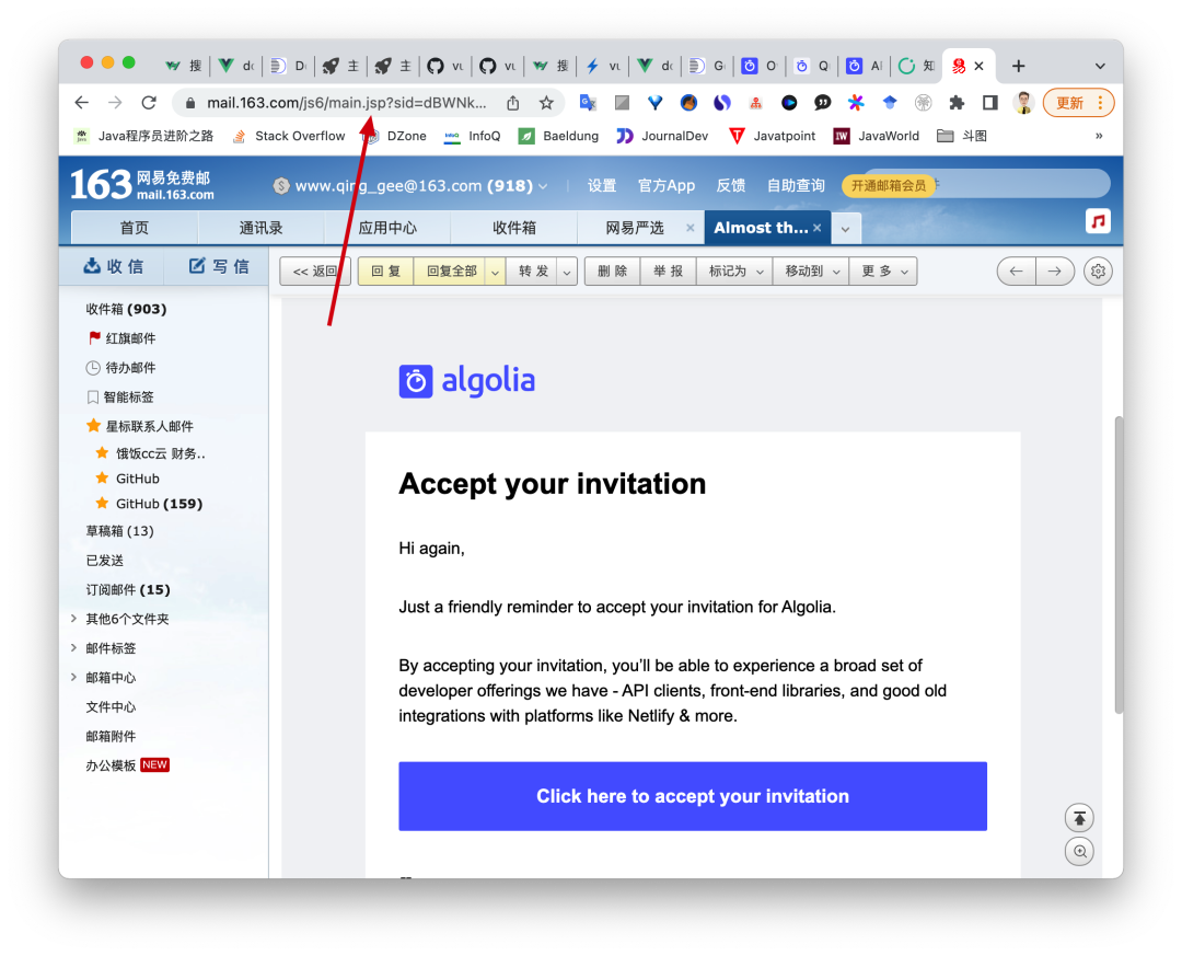 第二步,稍安勿躁地等待。邮箱里会收到 docsearch 的验证信息。点击 accept。