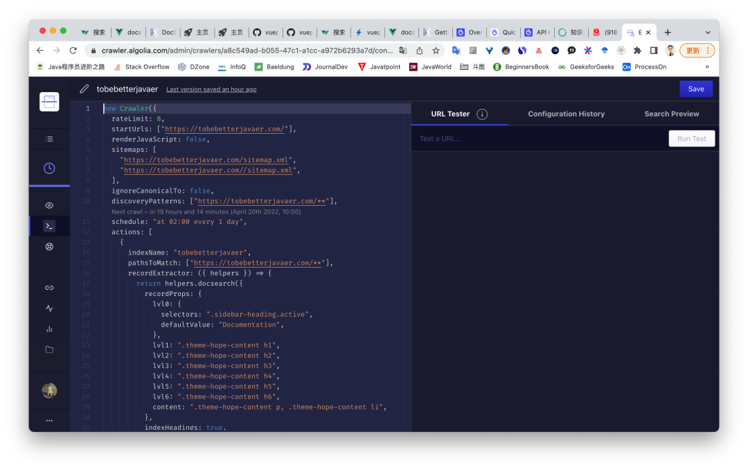 另外,记住 indexName、appId、apiKey,它们的值会在接下来配置 vuepress-theme-hope 主题的 DocSearch 插件用到。