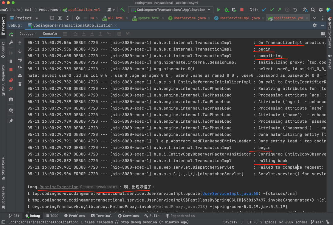 在浏览器中输入 http://localhost:8080/user/update 进行测试,注意查看日志,可以确认事务起效了。