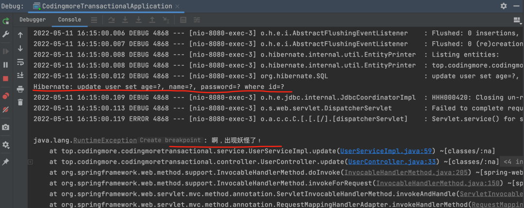 @Override@Transactionalpublic void update(User user) { userRepository.save(user); throw new RuntimeException("啊,出现妖怪了!");}