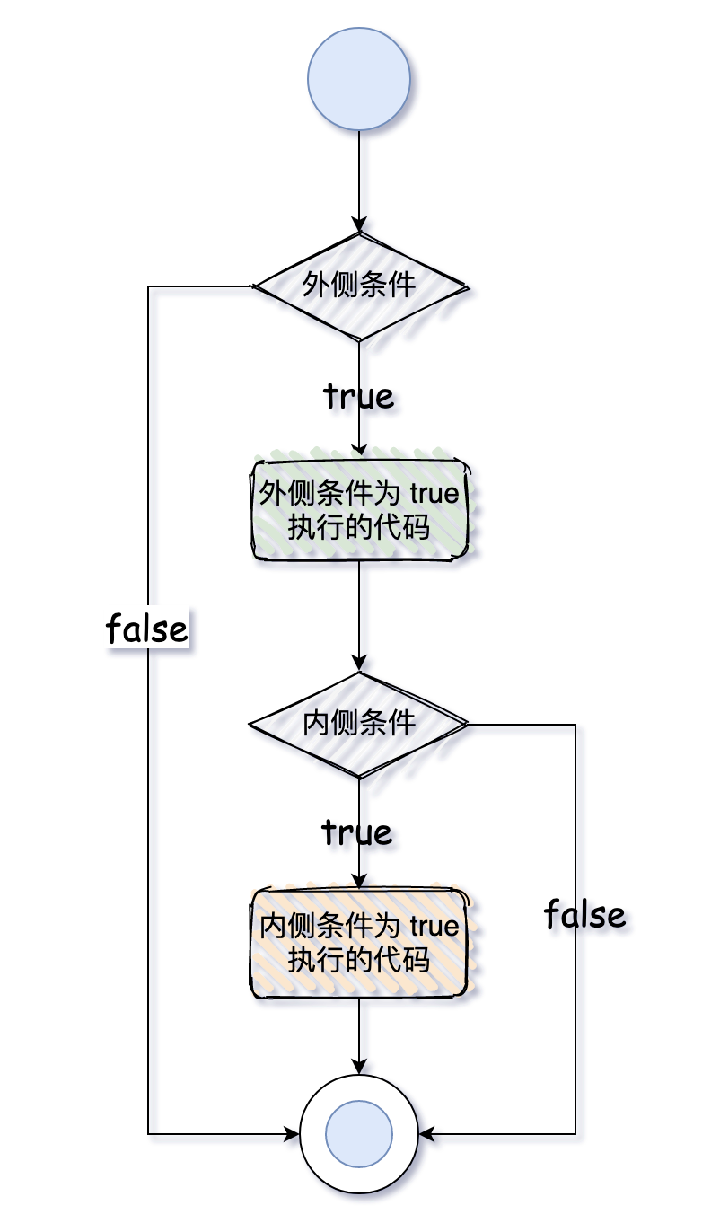 if(外侧条件){ // 外侧条件为 true 时执行的代码 if(内侧条件){ // 内侧条件为 true 时执行的代码 } }
