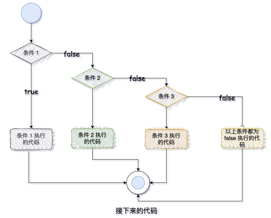 if(条件1){ // 条件1 为 true 时执行的代码}else if(条件2){ // 条件2 为 true 时执行的代码} else if(条件3){ // 条件3 为 true 时执行的代码} ... else{ // 以上条件均为 false 时执行的代码}