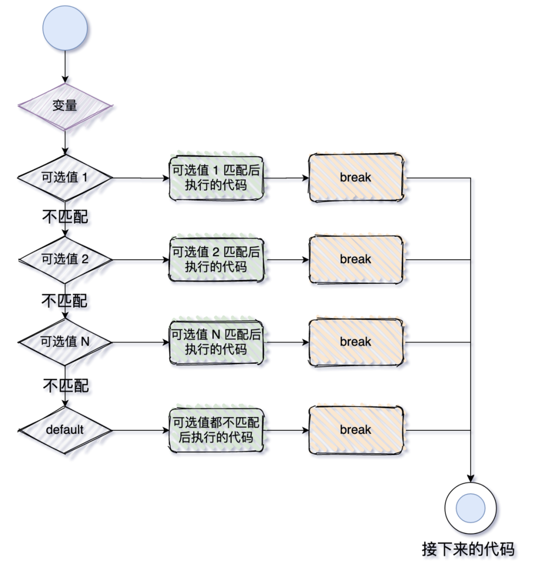switch(变量) { case 可选值1: // 可选值1匹配后执行的代码; break; // 该关键字是可选项case 可选值2: // 可选值2匹配后执行的代码; break; // 该关键字是可选项...... default: // 该关键字是可选项 // 所有可选值都不匹配后执行的代码 }